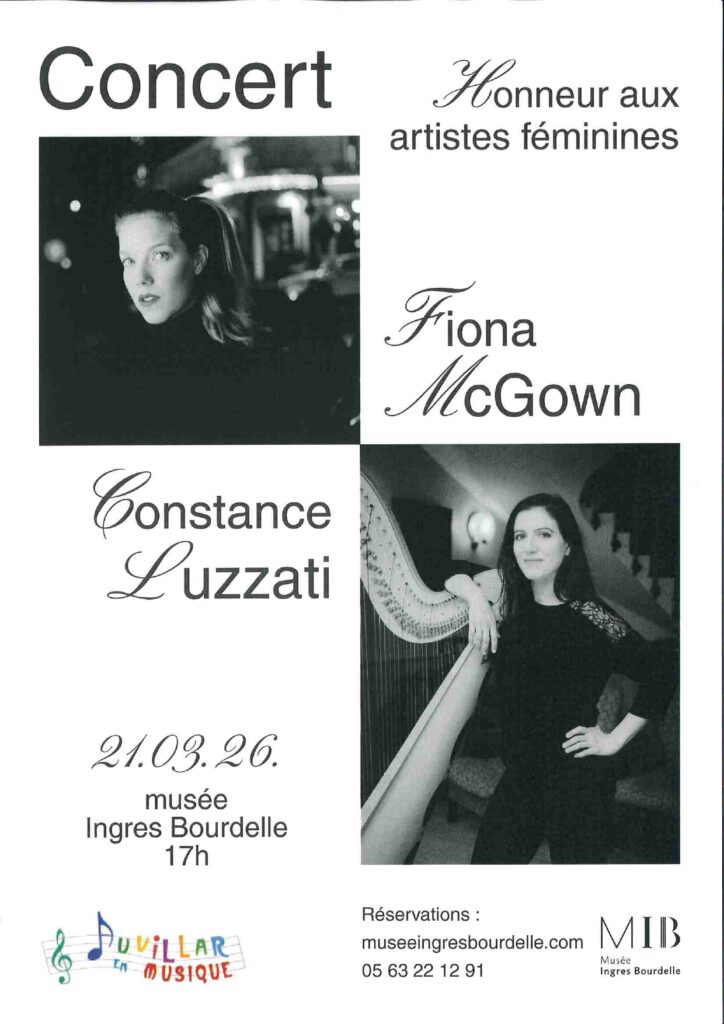 Dans le cadre de la semaine Olympe de GOUGE – montalbanaise, précurseure de mouvements féministes, guillotinée lors de la révolution française – la Mezzo Soprano Fiona MCGOWN et la harpiste Constance LUZZAT interpréteront des oeuvres de Lili BOULANGER, Marguerite CANAL, Amy BEACH, Augusta HOLMES.